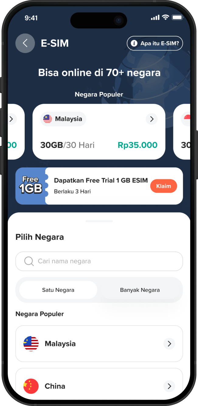 Flip menyediakan e-SIM Travel murah mulai Rp5.000 untuk lebih dari 100 negara, termasuk e-SIM Japan, e-SIM China, e-SIM Umrah (Saudi Arabia), e-SIM Korea, e-SIM Singapore, e-SIM Malaysia, e-SIM Hong Kong, dan e-SIM Eropa. Beli kartu SIM digital, aktifkan instan, dan langsung online di tujuan tanpa perlu ganti kartu fisik.